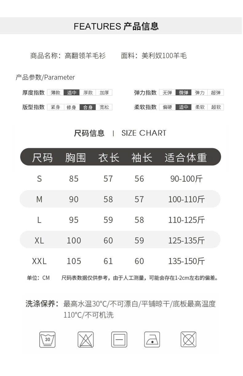 High-Collared Cashmere Sweater Women's Turtle Neck Pullover S-XXL