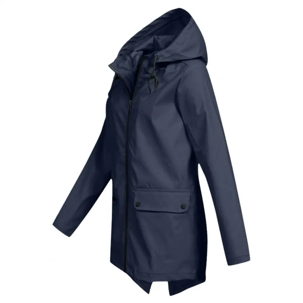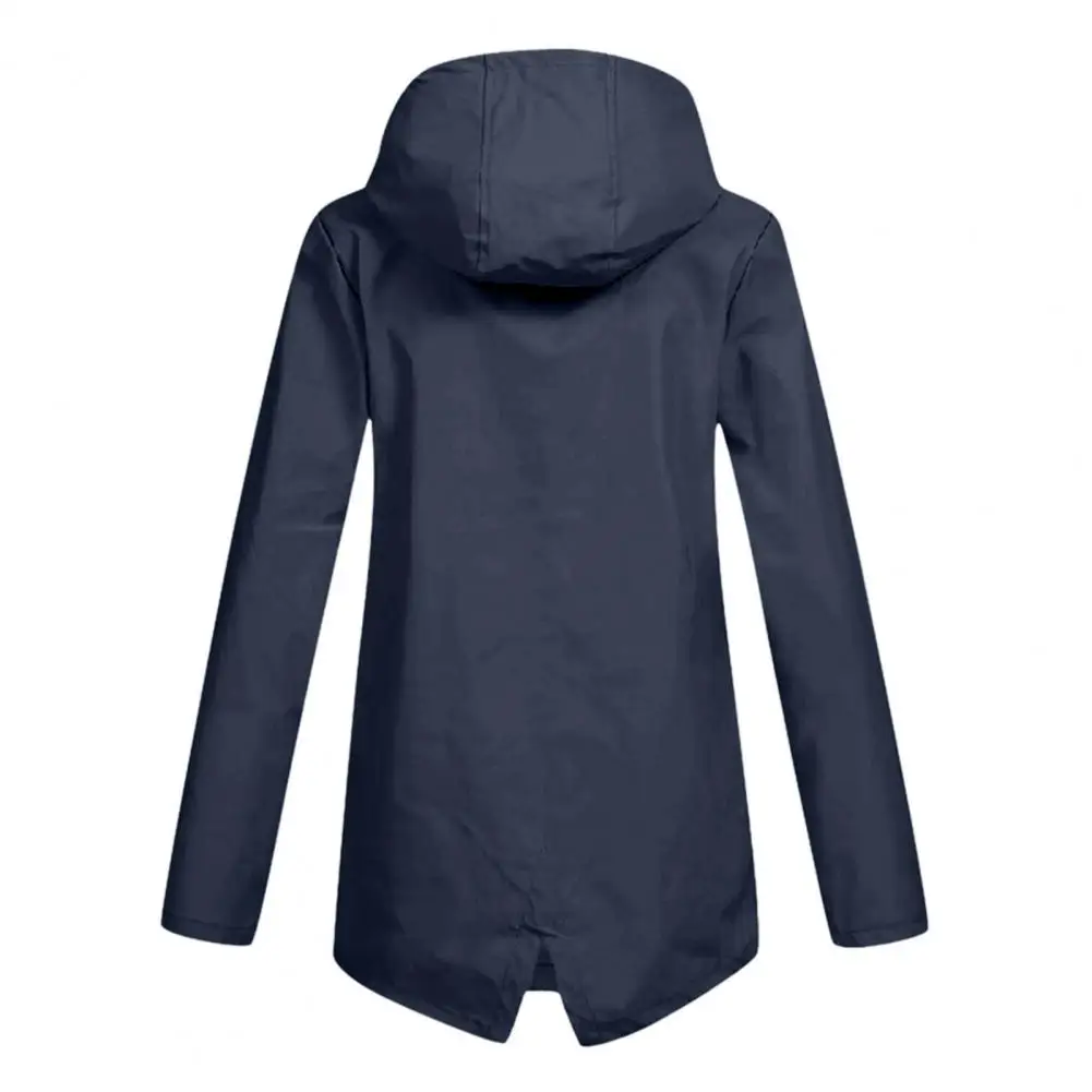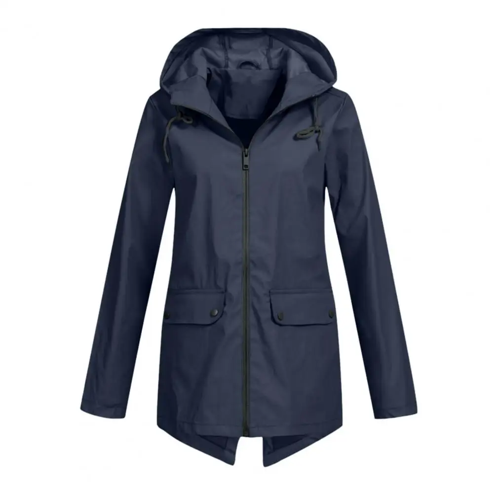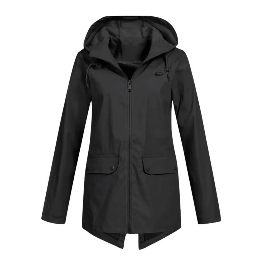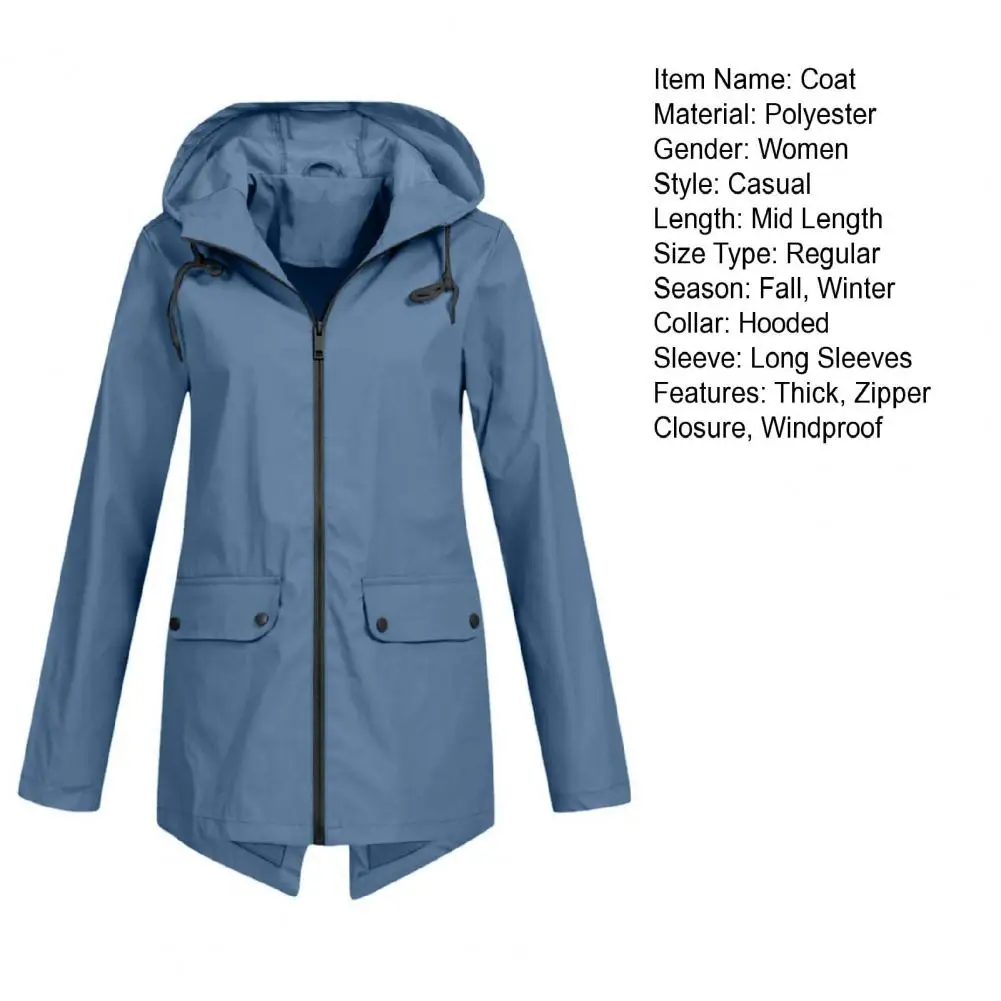 Women Fall Winter Coat Windproof Long Sleeves Hooded Drawstring Windbreaker Zipper Closure Pure Color Patch Pockets Daily Wear Outdoor Jacket