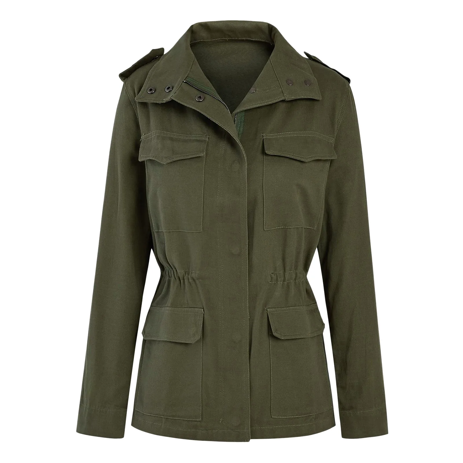 Design Military Versatile Anorak Jacket Comes with Pockets and Drawstring Waist Full Zip Up and Snap Button Closure Long Sleeve Solid Color Breathable Fabric.